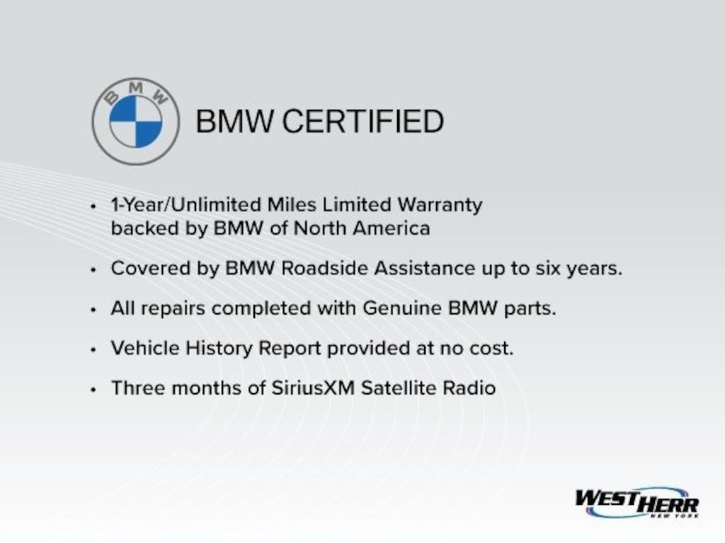 * 1 year/Unlimited miles beginning after new car warranty expires. 6-yrs Roadside Assistance. SiriusXM Satellite Radio 3-mos free. Every BMW Certified Plug-in Hybrid comes with an 8-Year/100,000-Mile Battery Guarantee. The Initial Battery Transfers to the New Owner.
