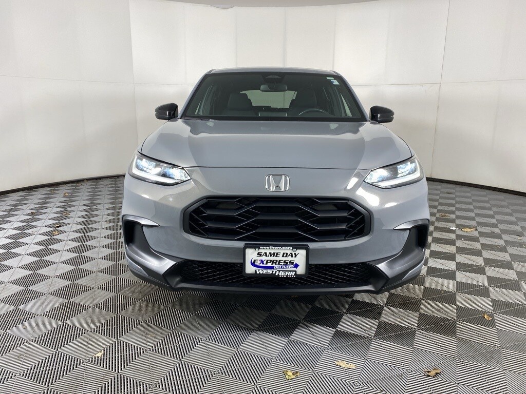 HR-V Sport, 4D Sport Utility, 2.0L I4 DOHC 16V i-VTEC, CVT, AWD, Black w/Cloth Seat Trim, 4-Wheel Disc Brakes, 6 Speakers, Adaptive Cruise Control: Adaptive Cruise Control (ACC) with Low-Speed Follow, Alloy wheels, Apple CarPlay/Android Auto, Auto High-beam Headlights, Automatic temperature control, Brake assist, Dual front impact airbags, Dual front side impact airbags, Exterior Parking Camera Rear, Front Center Armrest, Fully automatic headlights, Heated Front Bucket Seats, Power steering, Radio data system, Radio: 180-Watt Audio System w/6 Speakers, Rear window wiper, Remote keyless entry, Steering wheel mounted audio controls, Turn signal indicator mirrors, Wheels: 18" Gloss Black Alloy. 2023 Honda HR-V Sport Lunar Silver Metallic