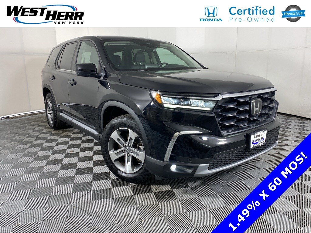 Pilot EX-L 8 Passenger, 4D Sport Utility, 3.5L V6 DOHC 24V, 10-Speed Automatic, AWD, 4-Wheel Disc Brakes, 9 Speakers, Adaptive Cruise Control: Adaptive Cruise Control (ACC) with Low-Speed Follow, Alloy wheels, Apple CarPlay/Android Auto, Auto High-beam Headlights, Automatic temperature control, Blind Spot Information (BSI) System warning, Dual front impact airbags, Dual front side impact airbags, Electronic Stability Control, Front Center Armrest, Front dual zone A/C, Front fog lights, Garage door transmitter: HomeLink, Heated door mirrors, Heated Front Bucket Seats, Lane departure: Lane Keeping Assist System (LKAS) active, Leather Seat Trim, Memory seat, Power passenger seat, Radio data system, Radio: 245-Watt Audio System, Rear air conditioning, Rear window wiper, Remote keyless entry, Speed-sensing steering, Speed-Sensitive Wipers, Steering wheel mounted audio controls, Turn signal indicator mirrors, Wheels: 18" Machined Face Pewter Gray. 2023 Honda Pilot EX-L 8 Passenger 8 Passenger Crystal Black Pearl
