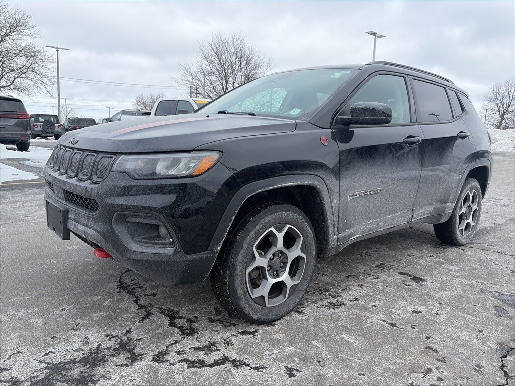 Certified. 2022 Jeep Compass Trailhawk Diamond Black Crystal Pearlcoat CARFAX One-Owner. Clean CARFAX. 115V Auxiliary Power Outlet, 2nd Row USB Type A/C Charge Only, 4-Wheel Disc Brakes, ABS brakes, Dual front impact airbags, Dual front side impact airbags, Electronic Stability Control, Four wheel independent suspension, Front Bucket Seats, Heated Front Seats, Knee airbag, Leather Wrapped Steering Wheel, Occupant sensing airbag, Overhead airbag, ParkView Rear Back-Up Camera, Power 2-Way Driver Lumbar Adjust, Power Adjust 8-Way Driver Seat, Quick Order Package 2GE, Remote keyless entry, Remote Start System, Reversible Carpet/Vinyl Cargo Mat, Split folding rear seat, Steering wheel mounted audio controls, Tachometer, Trailhawk Convenience Group, Trip computer, Vehicle Information Center, Windshield Wiper De-Icer.