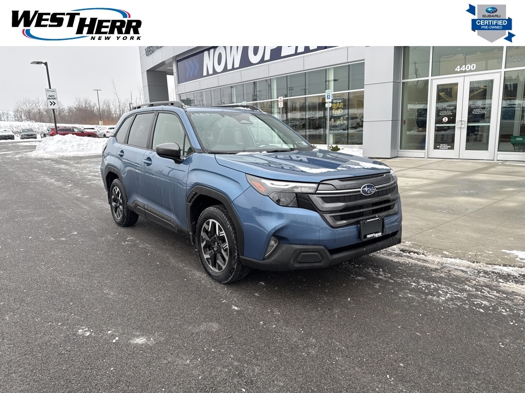 Certified. Horizon Blue Pearl 2025 Subaru Forester Premium AWD Lineartronic CVT 2.5L 4-Cylinder DOHC 16V Forester Premium, 4D Sport Utility, 2.5L 4-Cylinder DOHC 16V, Lineartronic CVT, AWD, Horizon Blue Pearl, Gray Cloth, 4-Wheel Disc Brakes, Auto High-beam Headlights, Auto-Dimming Mirror w/Compass & HomeLink, Automatic Emergency Steering, Blind-Spot Detection (BSD)/RCTA System, Emergency communication system: MySubaru Safety (3-year free trial), Exterior Parking Camera Rear, Four wheel independent suspension, Heated door mirrors, Heated Front Bucket Seats, Illuminated entry, Power moonroof: Panoramic, Power Rear Gate, Power Rear Gate & Blind Spot Detection w/RCTA, Premium Textured Cloth Upholstery, Radio: Subaru 11.6" Multimedia Plus System, Remote keyless entry, Wheels: 17" x 7.0 J Dark Metallic Aluminum-Alloy.