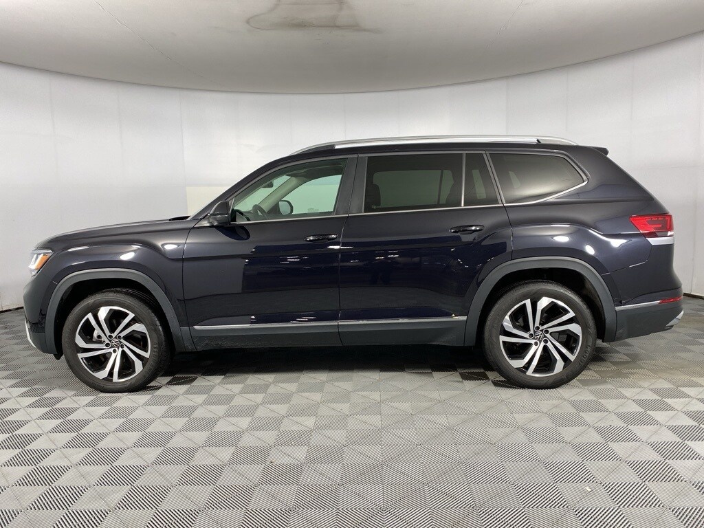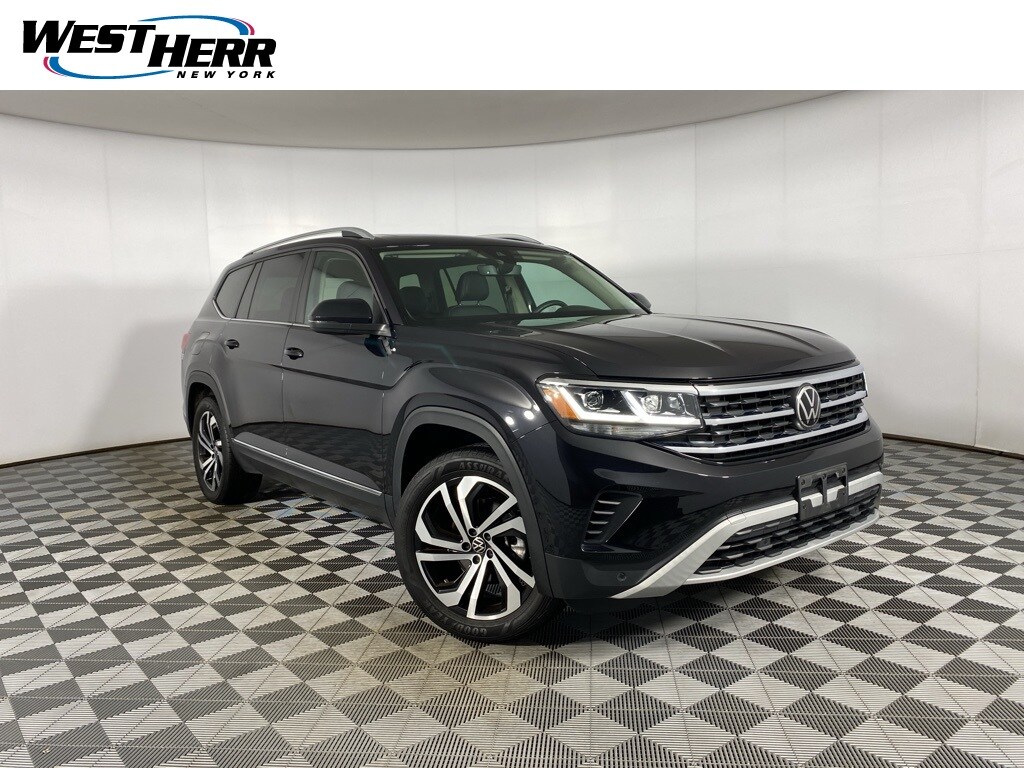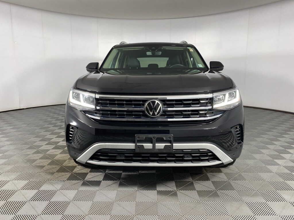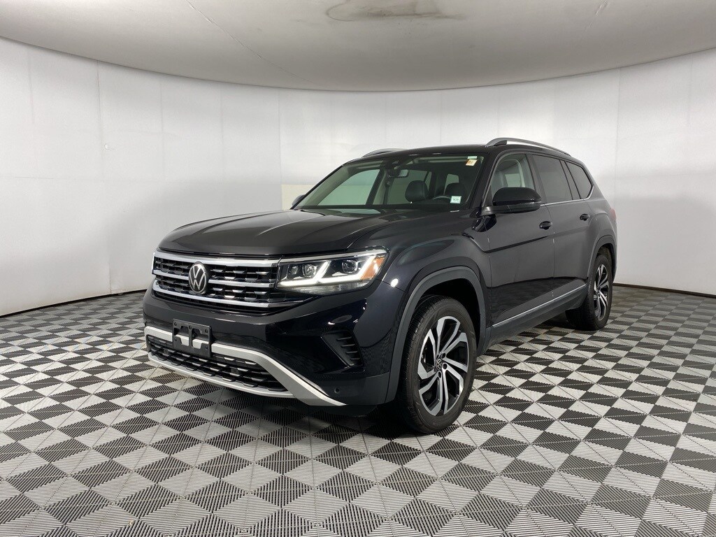 Certified. 2023 Volkswagen Atlas SEL Deep Black Pearl 3rd row seats: split-bench, Auto High-beam Headlights, Exterior Parking Camera Rear, Four wheel independent suspension, Front dual zone A/C, Fully automatic headlights, Heated Comfort Front Bucket Seats, Heated door mirrors, Heated front seats, Heated steering wheel, Memory seat, Navigation System, Perforated V-Tex Leatherette Seating Surfaces, Power Liftgate, Power passenger seat, Rain sensing wipers, Steering wheel mounted audio controls, Turn signal indicator mirrors, Wheels: 20" x 8J 5-Spoke 2-Tone Machined Alloy. Volkswagen Certified Pre-Owned Details: