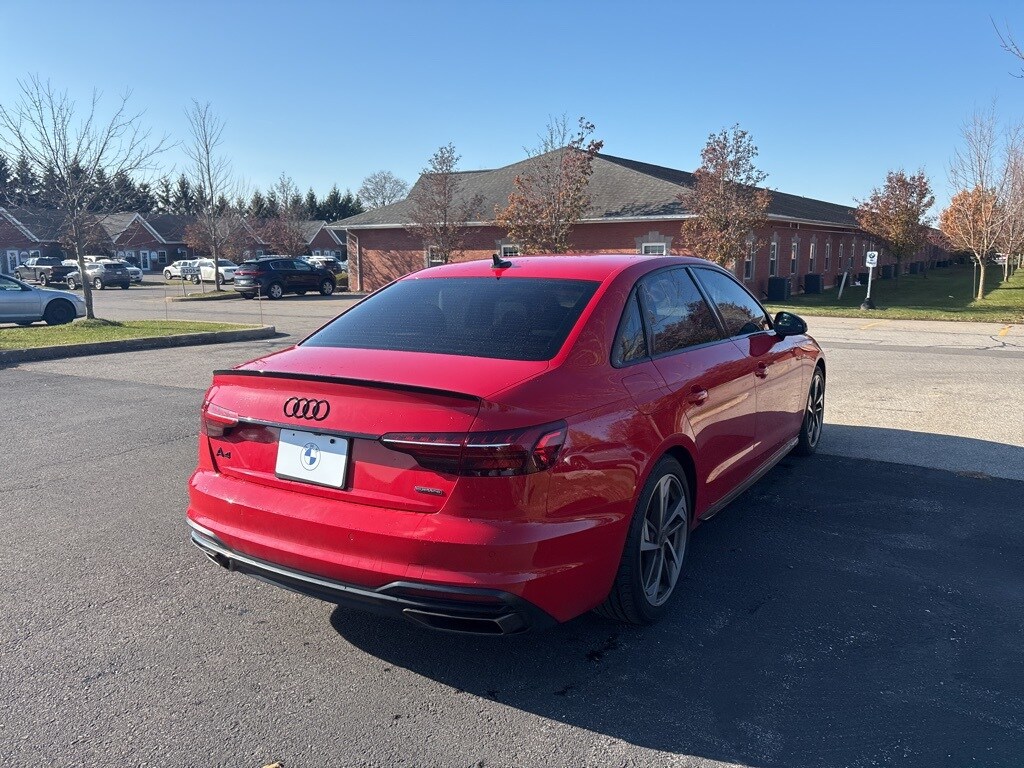 2023 Audi A4 45 S line Premium Plus quattro Tango Red 2 Rear USB Charge Ports, Adaptive Cruise Control, Alarm System w/Motion Sensor, Aluminum Ellipse Dark Inlays, Audi Active Lane Assist, Audi Advanced Key, Audi Connect PLUS, Audi Phone Box, Audi Side Assist w/Pre Sense Rear, Audi Virtual Cockpit Plus, Auto-Dimming Exterior Mirrors w/Memory, Bang & Olufsen Sound System w/3D Sound, Black Audi Rings & Model Badge, Black Exterior Trim & Mirror Housings, Black Optic Package, Black Side Sill Blades & Rear Lip Spoiler, Convenience Package, Dark Chrome Exhaust Tips, Hands-On Detection Steering Wheel, Heated Steering Wheel, Leatherette Covered Center Console & Door Armrests, Memory for Driver's Seat, MMI Navigation Plus, Navigation Package, Parking System Plus, Power Folding Exterior Mirrors, Premium Plus Package, Red Brake Calipers, SiriusXM w/360L, Top View Camera System, Traffic Jam Assist, Wheels: 18" 5-Arm Trapezoid Design Titanium Finish.