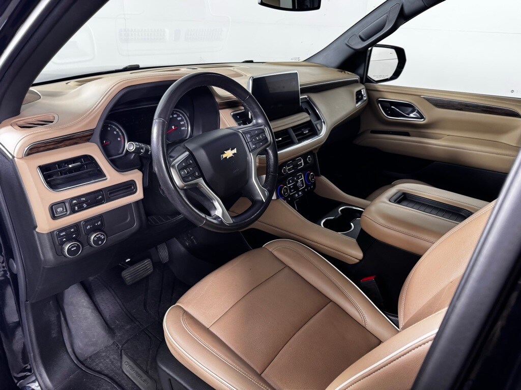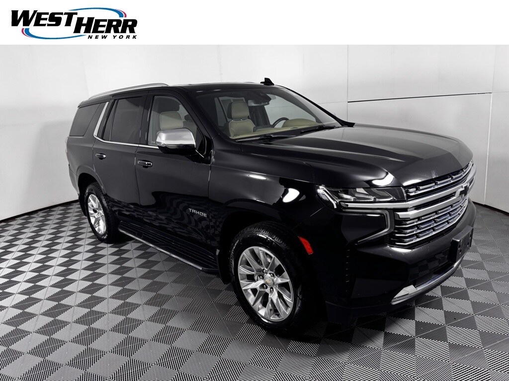 Black 2021 Chevrolet Tahoe Premier 4WD 10-Speed Automatic with Overdrive EcoTec3 5.3L V8 4WD, Jet Black/Maple Sugar w/Perforated Leather Seat Trim, 1st & 2nd Row Color-Keyed Carpeted Floor Mats, 2 USB Data Ports, 2-Speed Active Electronic AutoTrac Transfer Case, 3rd Row 60/40 Power-Folding Split-Bench Seat, Auto-Dimming Inside Rear-View Mirror, Automatic Heated Steering Wheel, Bright Front & Rear Door Sill Plates, Chrome Door Handles w/Body-Color Strip, Chrome Mirror Caps, Color-Keyed Carpeting Floor Covering, Driver & Front Outboard Passenger Airbags, Dual Exhaust System, Dual-Pane Power Panoramic Sunroof, Enhanced Driver Information Center, Floor Console w/Storage Area, Front & Rear Park Assist, Hands-Free Rear Power Programmable Liftgate, HD Radio, Heated 2nd Row Outboard Seats, Hill Descent Control, Infotainment Display, Lane Change Alert w/Side Blind Zone Alert, Lane Keep Assist w/Lane Departure Warning, Leather-Wrapped Steering Wheel, LED Daytime Running Lamps, License Plate Front Mounting Package, Memory Settings, Outside Heated Power-Adjustable Mirrors, Power Release 2nd Row Bucket Seats, Power Tilt & Telescopic Steering Column, Preferred Equipment Group 1LZ, Rear Cross Traffic Alert, Remote Start, Safety Alert Seat, SiriusXM NavTraffic, SiriusXM Radio w/360L, Universal Home Remote.