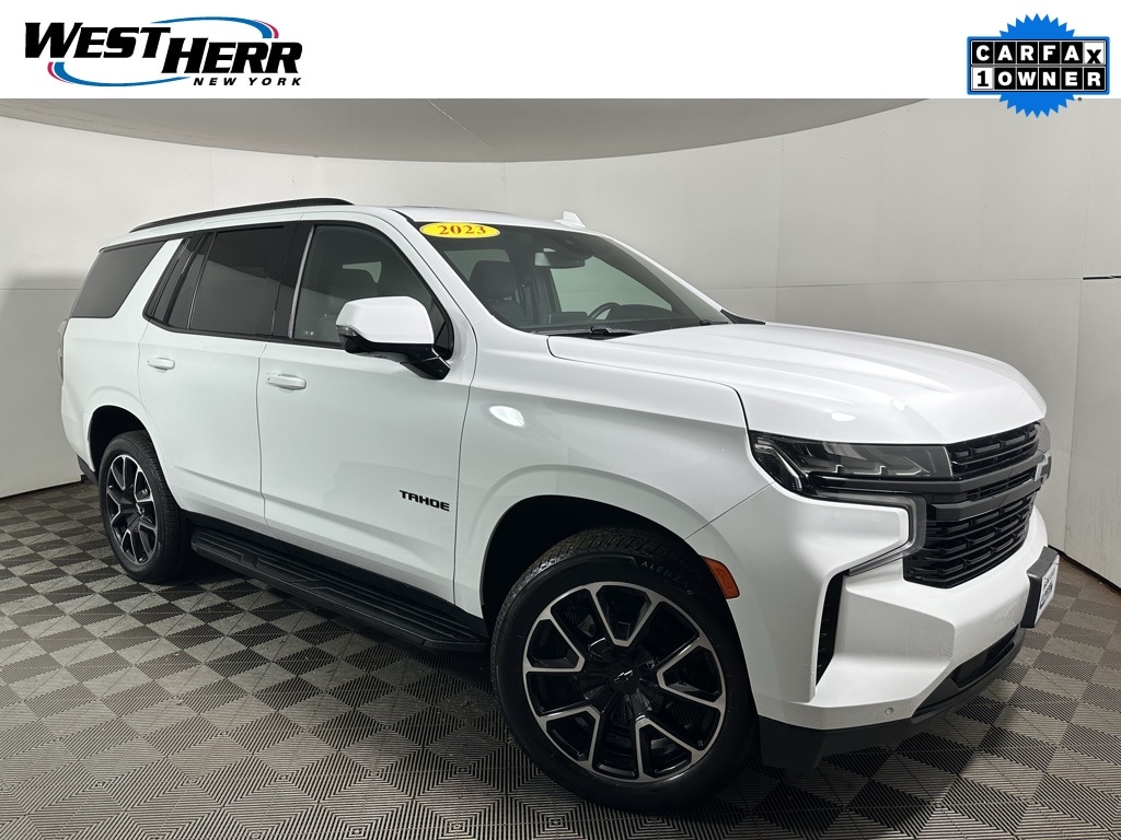 CARFAX One-Owner. 2023 Chevrolet Tahoe RST Summit White 4WD, Jet Black/Victory Red w/Perforated Leather Seat Trim, 1st & 2nd Row Color-Keyed Carpeted Floor Mats, 2-Speed Active Electronic AutoTrac Transfer Case, 2nd Row Pwr Release 60/40 Split-Folding Bench Seat, 3rd Row 60/40 Power-Folding Split-Bench Seat, Adaptive Cruise Control, Advanced Trailering Package, Alloy wheels, Auto-Dimming Inside Rear-View Mirror, Bose 9-Speaker Stereo Audio System Feature, Bright Front & Rear Door Sill Plates, Color-Keyed Carpeting Floor Covering, Driver & Front Outboard Passenger Airbags, Driver Alert Package, Dual-Pane Power Panoramic Sunroof, Enhanced Automatic Emergency Braking, Enhanced Driver Information Center, Extra Capacity Cooling System, Floor Console w/Storage Area, Hands-Free Rear Power Programmable Liftgate, HD Surround Vision, Heated 2nd Row Outboard Seats, Heated Steering Wheel, Hitch Guidance w/Hitch View, Infotainment Display, Integrated Trailer Brake Controller, Lane Change Alert w/Side Blind Zone Alert, LED Daytime Running Lamps, License Plate Front Mounting Package, Luxury Package, Max Trailering Package, Memory Settings, Memory Settings for Driver, Navigation System, Outside Heated Power-Adjustable Mirrors, Power Tilt & Telescopic Steering Column, Preferred Equipment Group 1SP, Rear Cross Traffic Alert, Rear Pedestrian Alert, Remote Start, Set of 4 Wheel Locks (LPO), SiriusXM Radio w/360L, Smart Trailer Integration Indicator, Universal Home Remote, Wheels: 22" x 9" Bright Machined, Wireless Charging, Wrapped Steering Wheel.