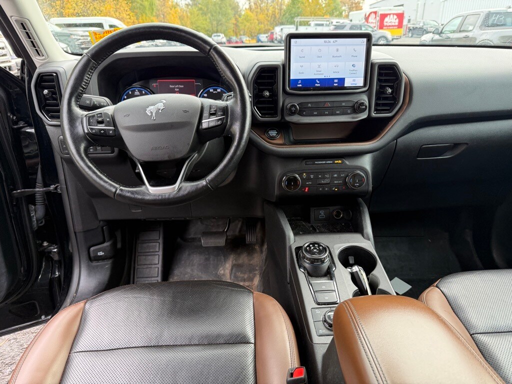 Shadow Black 2022 Ford Bronco Sport Badlands 4WD 8-Speed Automatic EcoBoost 2.0L I4 GTDi DOHC Turbocharged VCT Auto High-beam Headlights, Auto-Dimming Rear-View Mirror, Body-Colored Door Handles, Dual-Zone Electronic Automatic Temperature Control, Equipment Group 400A, HD Radio, Heated door mirrors, Heated front seats, Heated Steering Wheel, Leather-Trimmed Heated Sport Contour Bucket Seats, Power driver seat, Premium Package, Rear Parking Sensors, Remote keyless entry, Remote Start System, Steering wheel mounted audio controls, SYNC 3 Communications & Entertainment System, SYNC 3/Apple CarPlay/Android Auto, Universal Garage Door Opener (UGDO), Wireless Charging Pad.