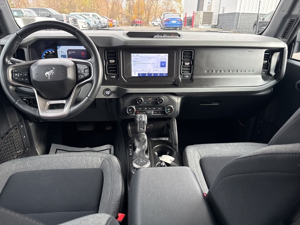 Iconic Silver Metallic 2023 Ford Bronco Big Bend 4WD 10-Speed Automatic 2.3L EcoBoost I-4 SOFT TOP, CLOTH W/PREP KIT, FRONT AXLE-OPEN DIFFRNTL, Assistance Kit, On-Road, 2-Door Intelligent Access w/Lock/Unlock, 3.73 Axle Ratio, Alloy wheels, Ambient Footwell Lighting, Auto High-Beam Headlamps, Auto-Dimming Interior Rear-View Mirror, Connected Navigation, Dr & Pass Illuminated Sliding Visor Vanity Mirrors, Dual-Zone Electronic Automatic Temperature Control, Enhanced Voice Recognition, Equipment Group 222A Mid Package, Exterior Parking Camera Rear, First Aid Kit, Front Row Heated Seats, Heated door mirrors, Illuminated entry, Leather Shift Knob, Navigation system: Connected Navigation, Power door mirrors, Power Outlet - Back Side of Center Floor Console, Pre-Collision Assist w/Automatic Emergency Braking, Rear Parking Sensors, Remote keyless entry, Remote Start System, Removable Hoop Step, SiriusXM Radio w/360L, Steering wheel mounted audio controls, SYNC 4, Wheels: 17" Carbonized Gray-Painted Aluminum.