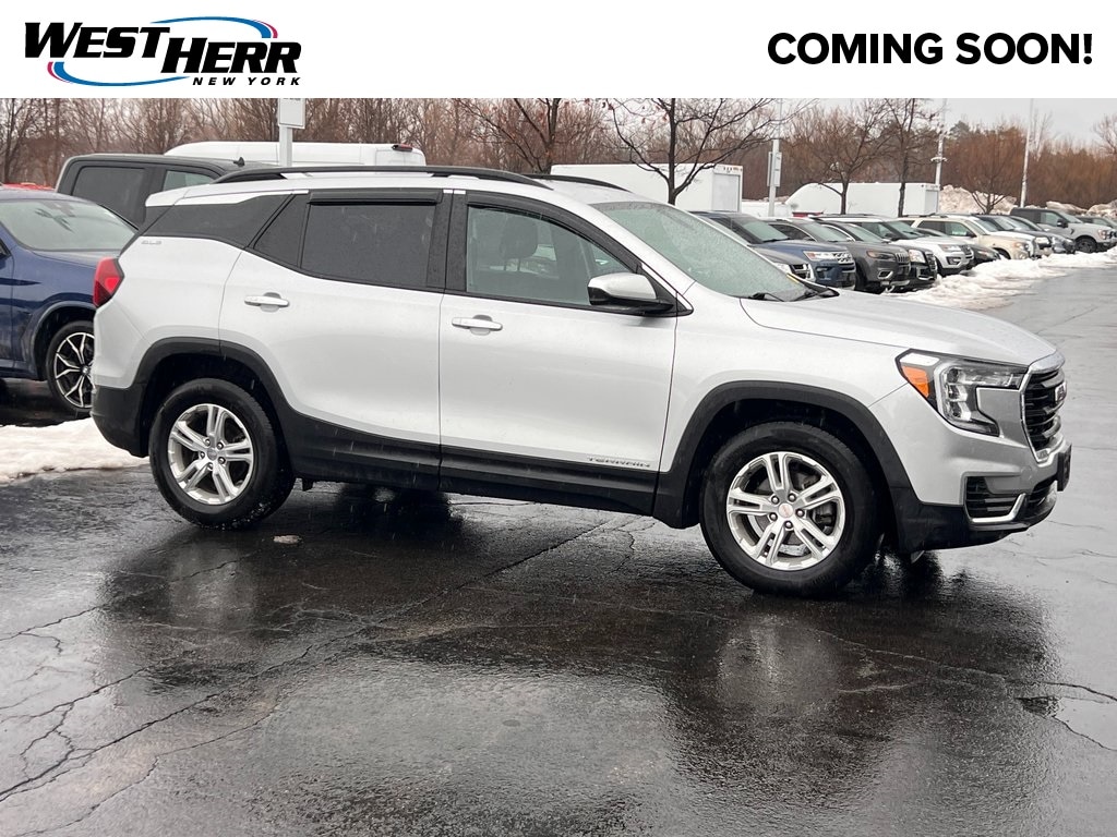 2022 GMC Terrain SLE Quicksilver Metallic CARFAX One-Owner. 8-Way Power Driver Seat Adjuster, Driver & Front Passenger Heated Seats, Driver Convenience Package, Dual-Zone Automatic Climate Control, Fully automatic headlights, Lane Departure Warning System, License Plate Front Mounting Package, Power Driver Lumbar Control, Power Programmable Rear Liftgate, Preferred Equipment Group 3SA, Remote Start, Roof-Mounted Luggage Rack Side Rails, Wheels: 17" x 7" Silver Painted Aluminum.