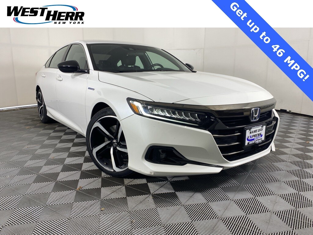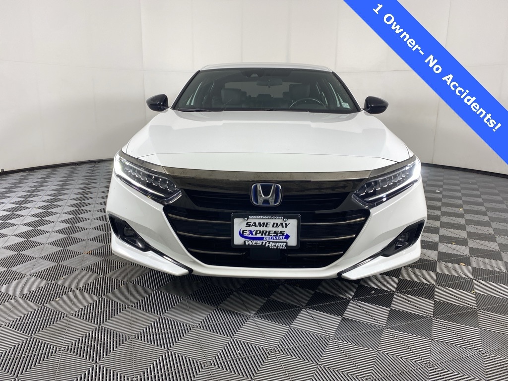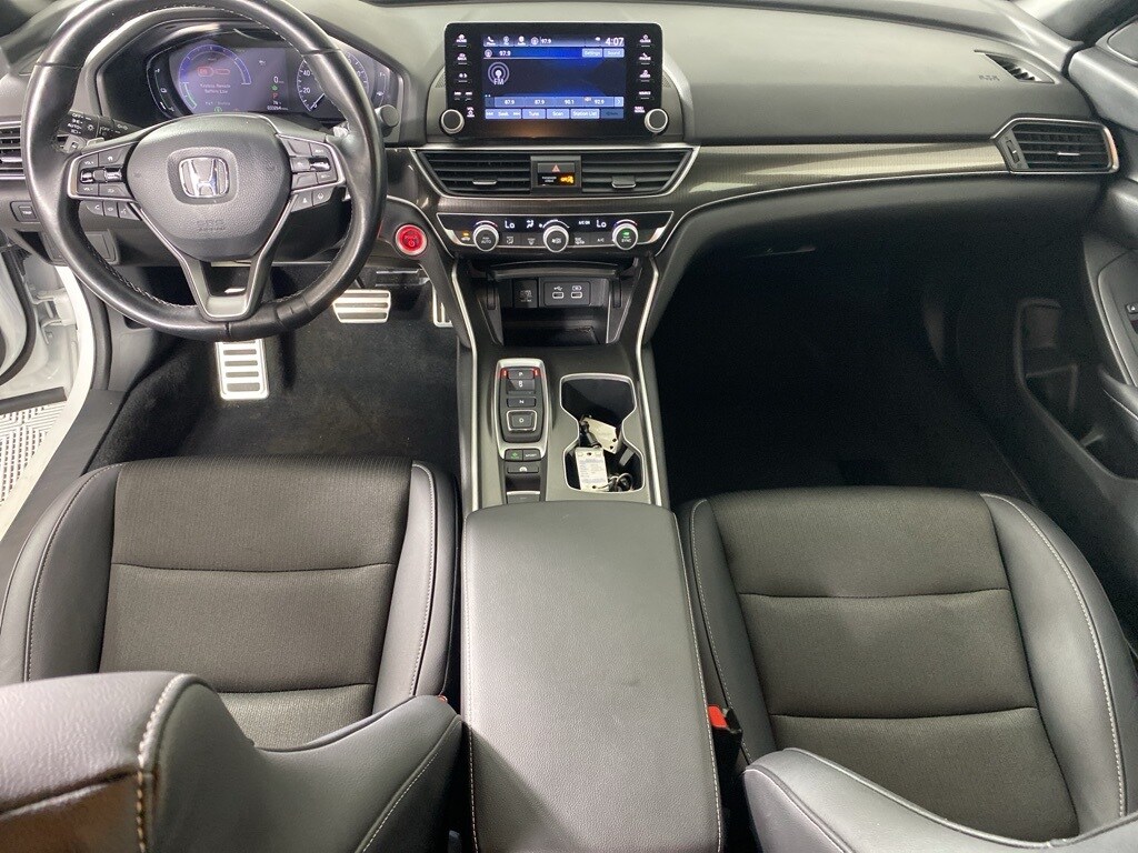 Accord Hybrid Sport, 4D Sedan, 2.0L 4-Cylinder DOHC 16V i-VTEC, eCVT, FWD, 4-Wheel Disc Brakes, 8 Speakers, Alloy wheels, Apple CarPlay/Android Auto, Auto High-beam Headlights, Automatic temperature control, Brake assist, Dual front impact airbags, Dual front side impact airbags, Exterior Parking Camera Rear, Forward collision: Collision Mitigation Braking System (CMBS) + FCW mitigation, Front Bucket Seats, Front Center Armrest, Front dual zone A/C, Front fog lights, Heated door mirrors, Lane Departure Warning System, Power driver seat, Radio data system, Radio: 180-Watt HD Audio System, Remote keyless entry, Speed-sensing steering, Speed-Sensitive Wipers, Steering wheel mounted audio controls, Wheels: 19" Machine-Finished Alloy w/Black Inserts. 2022 Honda Accord Hybrid Sport Platinum White Pearl