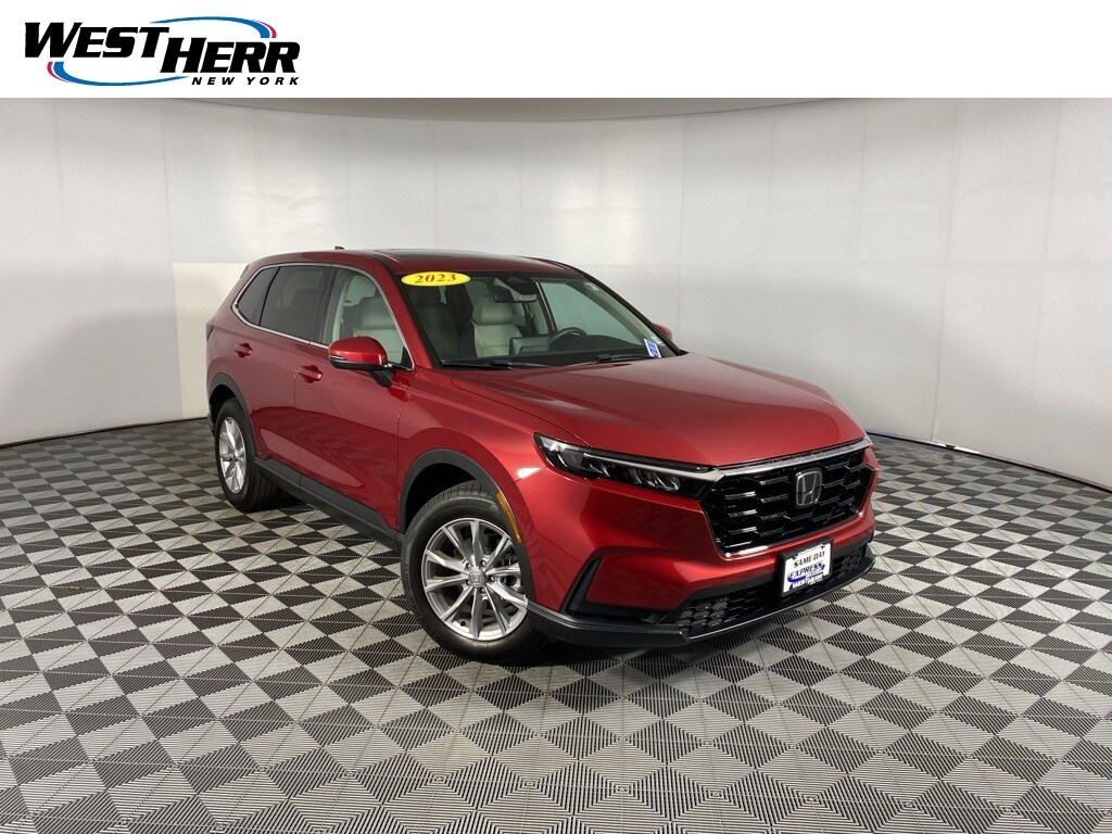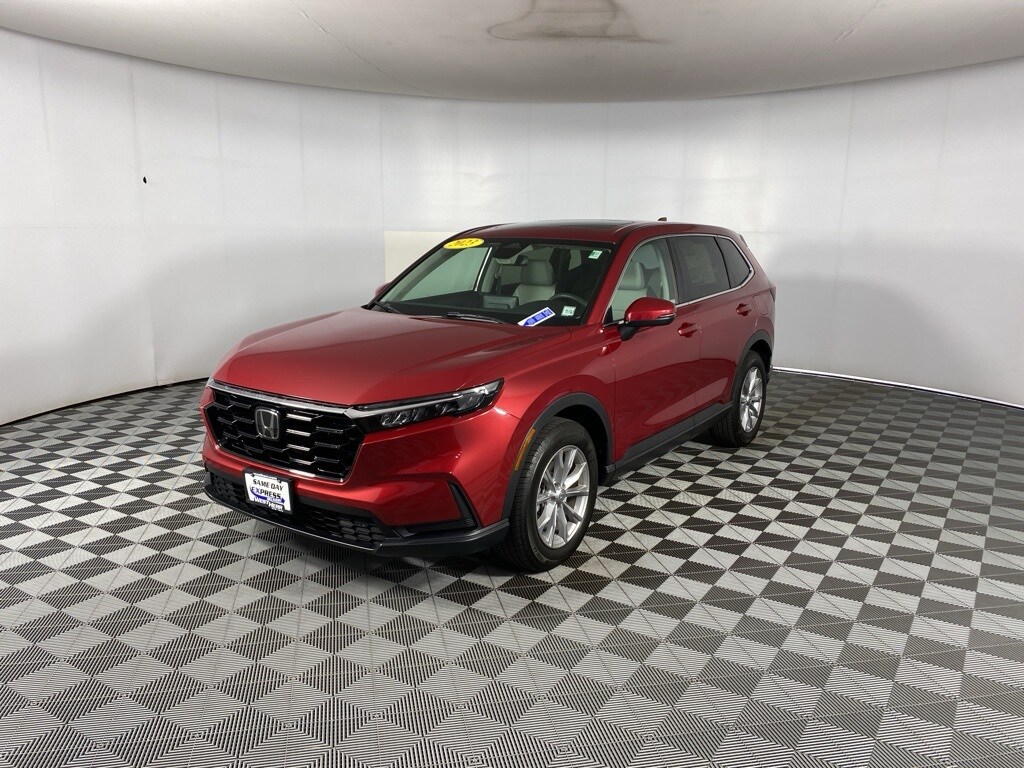 Radiant Red Metallic 2023 Honda CR-V EX AWD CVT 1.5L I4 DOHC 16V AWD, Adaptive Cruise Control: Adaptive Cruise Control (ACC) with Low-Speed Follow, Apple CarPlay/Android Auto, Brake assist, Exterior Parking Camera Rear, Heated door mirrors, Heated Front Bucket Seats, Power door mirrors, Power driver seat, Power moonroof, Power windows, Steering wheel mounted audio controls, Turn signal indicator mirrors.