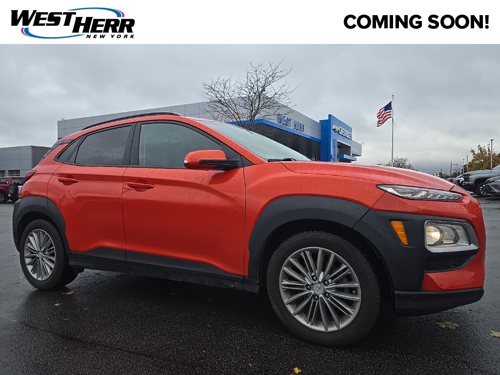 Kona SEL, 4D Sport Utility, I4, 6-Speed Automatic with Shiftronic, FWD, Sunset Orange, Black w/Cloth Seat Trim, 4-Wheel Disc Brakes, Cargo Net, Cargo Package, Radio: AM/FM/MP3/HD Radio/SiriusXM Audio System, Remote keyless entry, Reversible Cargo Tray, Traction control.