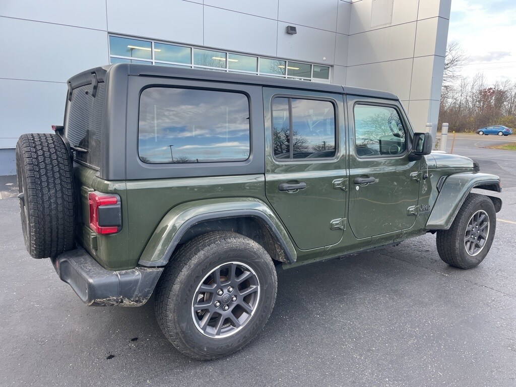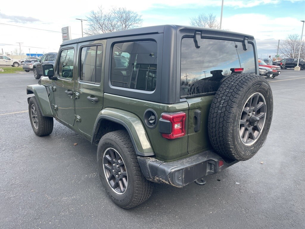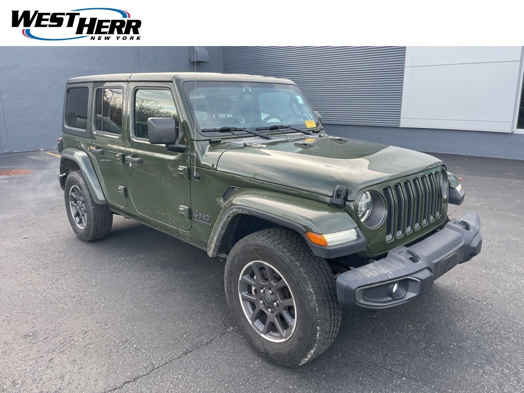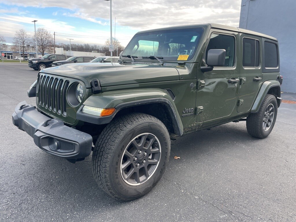 2021 Jeep Wrangler Sarge Green Clearcoat Clean CARFAX. 220 Amp Alternator, 4-Wheel Disc Brakes, 7.0" Touchscreen Display, 8.4" Radio & Premium Audio Group (DISC), ABS brakes, Air Conditioning w/Auto Temperature Control, Air Filtering, Alpine Premium Audio System, Annodized Gunmetal I/P Bezels, Apple CarPlay, Auto-Dimming Rear-View Mirror, Automatic Headlamps, Berber Floor Mats w/80th Anniversary Tag, Blind Spot & Cross Path Detection, Body Color Fender Flares, Body Color/Accent Color Grille, Cloth Bucket Seats w/80th Anniversary Tag (DISC), Cluster 7.0" TFT Color Display, Cold Weather Group, Convenience Group, Daytime Running Lamp System, Deep Tint Sunscreen Windows, Dual front impact airbags, Dual front side impact airbags, Emergency/Assistance Call, For More Info, Call 800-643-2112, Front 1-Touch Down Power Windows, Front LED Fog Lamps, Google Android Auto, GPS Antenna Input, Gray/Black Jeep Badges, Gray/Black Trail Rated Badge, Heated Front Seats, Heated Steering Wheel, Heavy Duty Suspension w/Gas Shocks, Injection Molded Black Rear Bumper, Integrated Center Stack Radio, Jeep 80th Anniversary Badges, Jeep 80th Anniversary Console Badge, Jeep 80th Swing Gate Plaque, Leather Wrapped Steering Wheel, LED Headlamp & Fog Lamp Group, LED Premium Reflector Headlamps, LED Taillamps, Light Tungsten Interior Accents, Mold In Color Bumper w/Neutral Gray, Occupant sensing airbag, ParkSense Rear Park Assist System, Power Heated Mirrors, Quick Order Package 25Q 80th Edition (DISC), Radio: Uconnect 4 w/7" Display, Remote Keyless Entry, Remote Proximity Keyless Entry, Safety Group, Security Alarm, Selectable Tire Fill Alert, SiriusXM Radio Service, SiriusXM Satellite Radio, Speed Sensitive Power Locks, Steering wheel mounted audio controls, Sun Visors w/Illuminated Vanity Mirrors, Tachometer, Technology Group (DISC), Trip computer, Universal Garage Door Opener, USB Host Flip, Wheels: 18" x 7.5" Granite Crystal Aluminum (DISC).