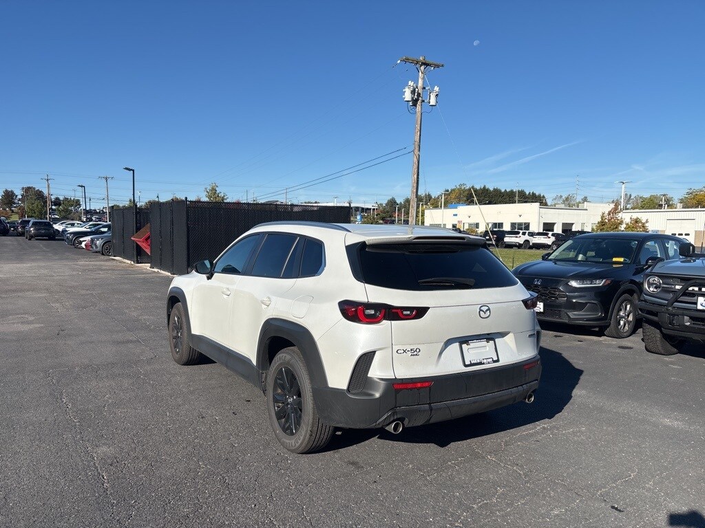 Certified. Clean CARFAX. CARFAX One-Owner. Odometer is 8699 miles below market average! 4D Sport Utility Wind Chill Pearl 2025 Mazda CX-50 25/31 City/Highway MPG 2.5 S Select Package AWD 6-Speed Automatic SKYACTIV® 2.5L 4-Cylinder DOHC 16V 25/31 City/Highway MPG ONE OWNER, CLEAN CARFAX/NO ACCIDENTS REPORTED, REMAINDER OF FACTORY WARRANTY, BLUETOOTH, BACK UP CAMERA, ALL WHEEL DRIVE, APPLE CARPLAY/ANDROID AUTO, PROFESSIONALLY DETAILED, CX-50 2.5 S Select Package, SKYACTIV® 2.5L 4-Cylinder DOHC 16V, AWD, ABS brakes, All-Weather Floor Mats, AppLink/Apple CarPlay and Android Auto, Auto High-beam Headlights, Automatic temperature control, Brake assist, Cargo Liner w/Seatback Protection, Dual front impact airbags, Dual front side impact airbags, E911 Automatic Emergency Notification, Electronic Stability Control, Emergency communication system: MAZDA CONNECT, Exterior Parking Camera Rear, Front Center Armrest, Fully automatic headlights, Half Leatherette Seat Trim, Illuminated entry, Infotainment System Voice Command, Knee airbag, Leather Shift Knob, Leather steering wheel, Multifunction Commander Control, Occupant sensing airbag, Overhead airbag, Overhead console, Panic alarm, Power door mirrors, Radio Broadcast Data System Program Information, Radio: AM/FM/HD Audio System, Rain sensing wipers, Rear window defroster, Rear window wiper, Remote keyless entry, Roadside Assistance Kit, SMS Text Msg Audio Delivery & Reply, Speed control, Steering wheel mounted audio controls, Telescoping steering wheel, Traction control, Turn signal indicator mirrors, Variably intermittent wipers, Weather Package, Wheels: 17" x 7J Aluminum Alloy, Wind Chill Pearl Paint Charge.