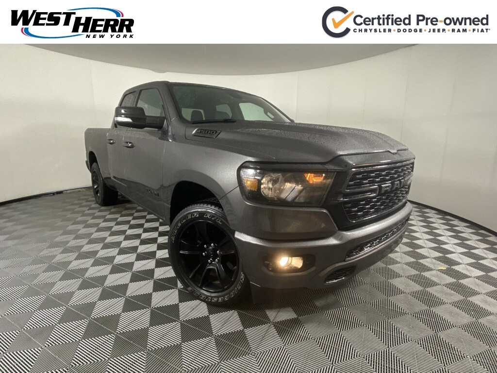 Certified. 2022 Ram 1500 Big Horn/Lone Star Granite Crystal Metallic Clearcoat Clean CARFAX. CARFAX One-Owner. 115V Auxiliary Power Outlet, 115V Auxiliary Rear Power Outlet, 3 Rear Seat Head Restraints, 4 Way Front Headrests, 400W Inverter, 4G LTE Wi-Fi Hot Spot, 8.4" Touchscreen Display, Accent Color Premium Power Mirrors, Air Conditioning ATC w/Dual Zone Control, Anti-Spin Differential Rear Axle, Apple CarPlay, Auto-Dimming Exterior Driver Mirror, Auto-Dimming Rear-View Mirror, Big Horn Badge, Big Horn Level 2 Equipment Group, Black Exterior Mirrors, Black Exterior Truck Badging, Black Headlamp Bezels, Black Interior Accents, Black Painted Exterior Mirrors Caps, Black Premium Power Mirrors, Bluetooth Handsfree Phone & Audio, Body Color Front Bumper, Body Color Rear Bumper w/Step Pads, Bucket Seats, Class IV Receiver Hitch, Cluster 7.0" TFT Color Display, Connectivity - US/Canada, Convex Wide-Angle Mirror Insert, Delete LED Lamp - Floor Console Bin, Deluxe Cloth Bucket Seats, Dual Exhaust w/Black Tips, Exterior Mirrors Courtesy Lamps, Exterior Mirrors w/Heating Element, Exterior Mirrors w/Supplemental Signals, For Details, Visit DriveUconnect.com, For More Info, Call 800-643-2112, Front Seat Back Map Pockets, Full Length Floor Console, Global Telematics Box Module (TBM), Glove Box Lamp, Google Android Auto, GPS Antenna Input, Grille Surround 1 Black Texture 2 Black, Heated Front Seats, Heated Steering Wheel, Integrated Center Stack Radio, Manual Adjust 4-Way Front Passenger Seat, Media Hub w/2 Charge Only USBs, Night Edition, Night Edition (DISC), ParkSense Front/Rear Park Assist w/Stop, Power 2-Way Driver Lumbar Adjust, Power 8-Way Driver Seat, Power Adjustable Pedals, Power-Folding Mirrors, Quick Order Package 25Z Big Horn, Radio: Uconnect 5 W w/8.4" Display, Rear 60/40 Folding Seat, Rear Dome w/On/Off Switch Lamp, Rear Power Sliding Window, Rear Window Defroster, Remote Start System, Security Alarm, SiriusXM Radio Service, SiriusXM Satellite Radio, Sun Visors w/Illuminated Vanity Mirrors, Universal Garage Door Opener, USB Host Flip, Wheels: 20" x 9.0" Premium Paint/Polished.
