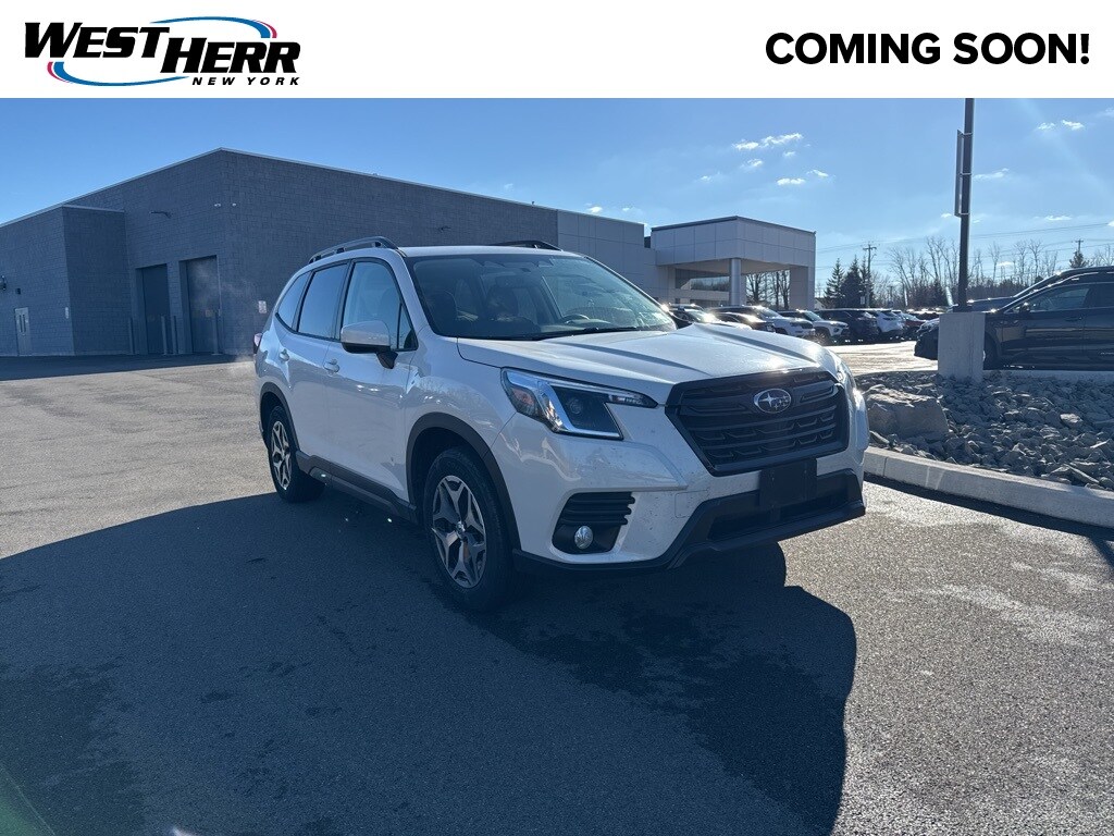 Crystal White Pearl 2023 Subaru Forester Premium AWD Lineartronic CVT 2.5L 4-Cylinder DOHC 16V Forester Premium, 4D Sport Utility, 2.5L 4-Cylinder DOHC 16V, Lineartronic CVT, AWD, Crystal White Pearl, 4-Wheel Disc Brakes, Auto High-beam Headlights, Blind Spot Detection w/RCTA & Power Rear Gate, Blind-Spot Detection (BSD), Driver's Seatback Divided Pocket, Dual USB Charge Ports, Exterior Parking Camera Rear, EyeSight System, Four wheel independent suspension, Heated door mirrors, Heated Front Bucket Seats, Illuminated entry, Multi-Function High Grade Display, Power moonroof: Panoramic, Power Rear Gate, Premium Cloth Upholstery, Radio: Subaru Starlink 6.5" Multimedia Plus System, Remote keyless entry, STARLINK/Apple CarPlay/Android Auto, Wheels: 17" x 7.0 J Black Machine Finish Alloy.
