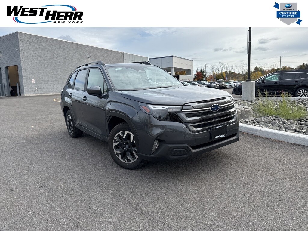 Certified. Magnetite Gray Metallic 2025 Subaru Forester Premium AWD Lineartronic CVT 2.5L 4-Cylinder DOHC 16V Forester Premium, 4D Sport Utility, 2.5L 4-Cylinder DOHC 16V, Lineartronic CVT, AWD, Magnetite Gray Metallic, Gray Cloth, Auto High-beam Headlights, Auto-Dimming Mirror w/Compass & HomeLink, Automatic Emergency Steering, Blind-Spot Detection (BSD)/RCTA System, Exterior Parking Camera Rear, Four wheel independent suspension, Heated Front Bucket Seats, Illuminated entry, Leather steering wheel, LED Upgrade, Power moonroof: Panoramic, Power Rear Gate, Power Rear Gate & Blind Spot Detection w/RCTA, Premium Textured Cloth Upholstery, Remote keyless entry, Wheels: 17" x 7.0 J Dark Metallic Aluminum-Alloy.