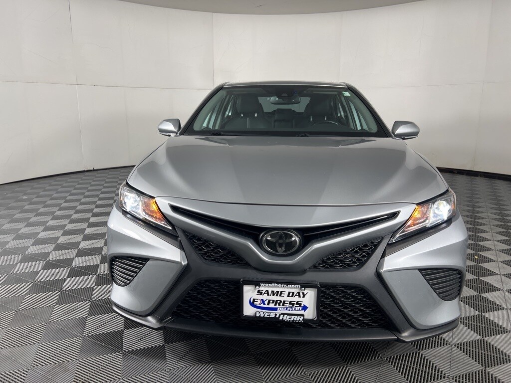 2019 Toyota Camry SE Celestial Silver Metallic 4-Wheel Disc Brakes, ABS brakes, Apple CarPlay, Brake assist, Dual front impact airbags, Dual front side impact airbags, Exterior Parking Camera Rear, Fabric Seat Trim w/SofTex, Front Bucket Seats, Front Center Armrest, Knee airbag, Occupant sensing airbag, Overhead airbag, Power driver seat, Radio: Entune 3.0 Audio w/App Suite, Rear side impact airbag, Remote keyless entry, Split folding rear seat, Steering wheel mounted audio controls, Tachometer, Trip computer.