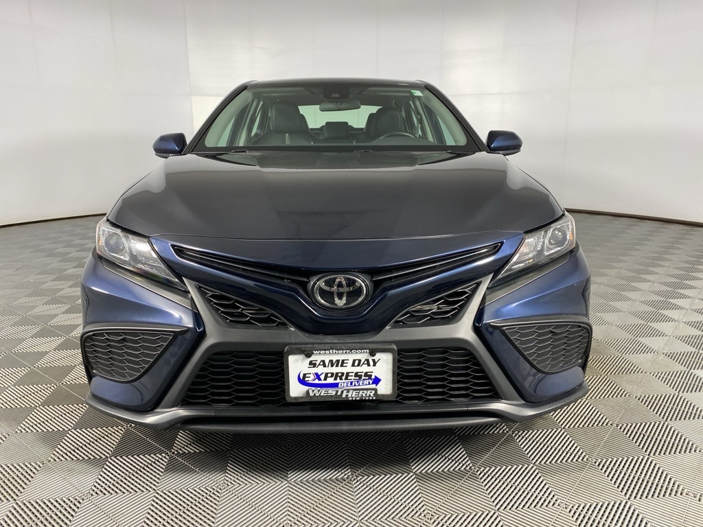 2021 Toyota Camry SE Black CARFAX One-Owner. 4-Wheel Disc Brakes, 6 Speakers, Air Conditioning, Apple CarPlay/Android Auto, Auto High-beam Headlights, Bumpers: body-color, Delay-off headlights, Driver door bin, Dual front impact airbags, Dual front side impact airbags, Electronic Stability Control, Exterior Parking Camera Rear, Fabric Seat Trim w/Sport SofTex, Four wheel independent suspension, Front Bucket Seats, Front Center Armrest, Knee airbag, Occupant sensing airbag, Outside temperature display, Overhead airbag, Passenger vanity mirror, Power driver seat, Power windows, Radio data system, Rear side impact airbag, Rear window defroster, Security system, Speed control, Split folding rear seat, Tachometer, Telescoping steering wheel, Tilt steering wheel, Traction control, Trip computer. 25/34 City/Highway MPG