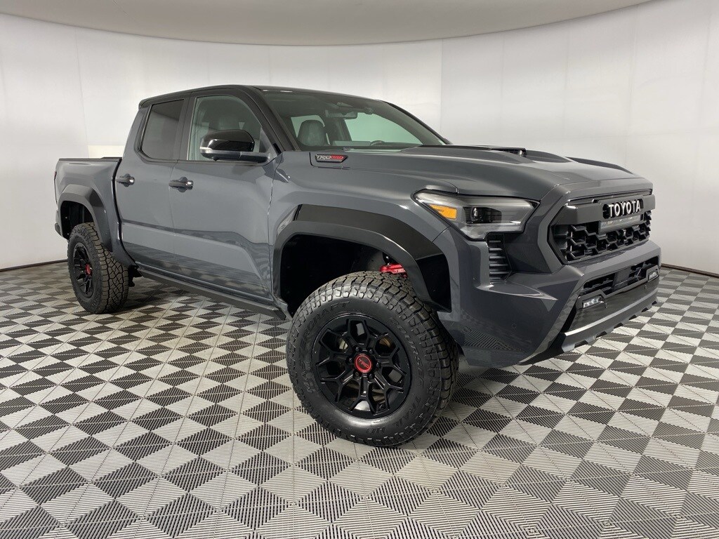 Certified. 2024 Toyota Tacoma Hybrid TRD Pro Gray Clean CARFAX. CARFAX One-Owner. 4-Wheel Disc Brakes, 9 Speakers, Air Conditioning, Auto High-beam Headlights, Auto-dimming Rear-View mirror, Driver door bin, Driver vanity mirror, Dual front impact airbags, Dual front side impact airbags, Electronic Stability Control, Front Bucket Seats, Front Center Armrest, Front dual zone A/C, Fully automatic headlights, Garage door transmitter: HomeLink, Heads-Up Display, Heated front seats, Illuminated entry, JBL Premium Audio, Knee airbag, Leather steering wheel, Occupant sensing airbag, Overhead airbag, Overhead console, Power moonroof, Power passenger seat, Power steering, Rear step bumper, Security system, SofTex Seat Trim, Speed control, Speed-sensing steering, Split folding rear seat, Steering wheel mounted audio controls, Tachometer, Telescoping steering wheel, Tilt steering wheel, Traction control, Trip computer, Ventilated front seats.